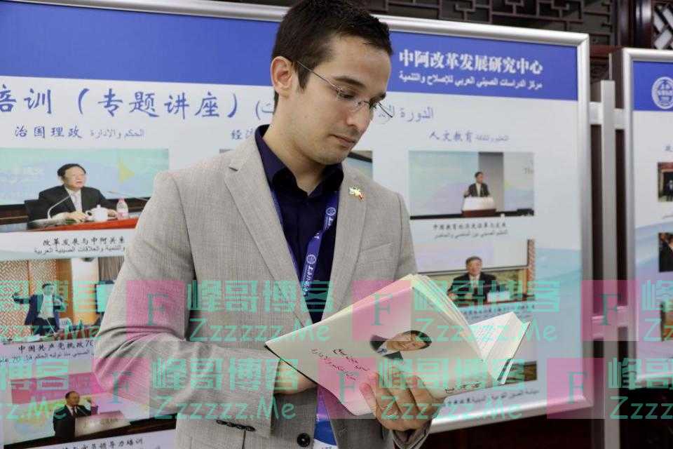 阿尔及利亚驻华大使馆二秘赫鲁飞·比拉勒在中阿改革发展研究中心翻阅阿文版《习近平谈治国理政》第二卷。