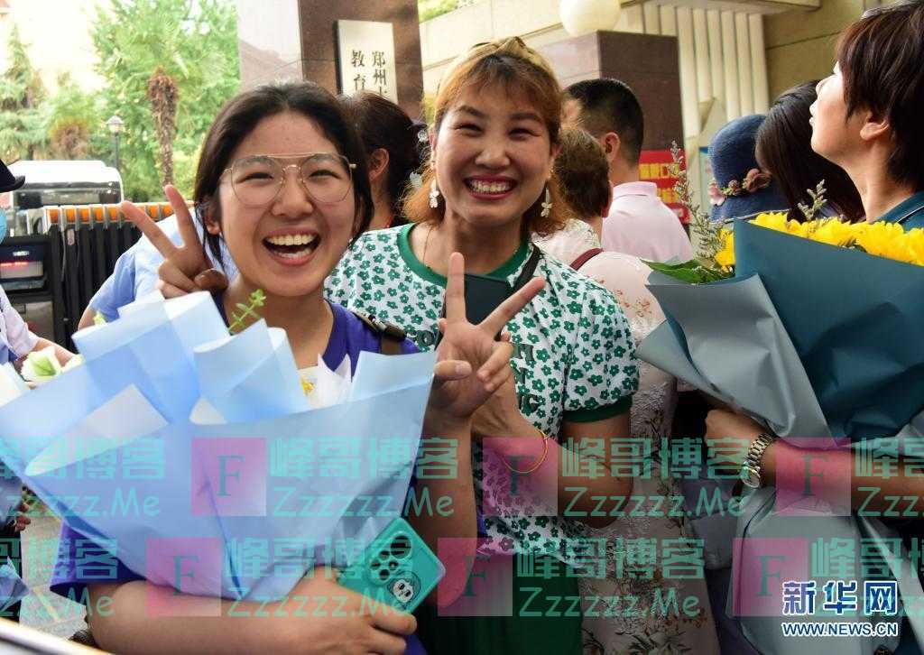 6月8日,在河南省郑州市为民高中考点,考生和家长一起庆祝。 当日,全国部分地区2021年高考结束。新华社记者 朱祥 摄