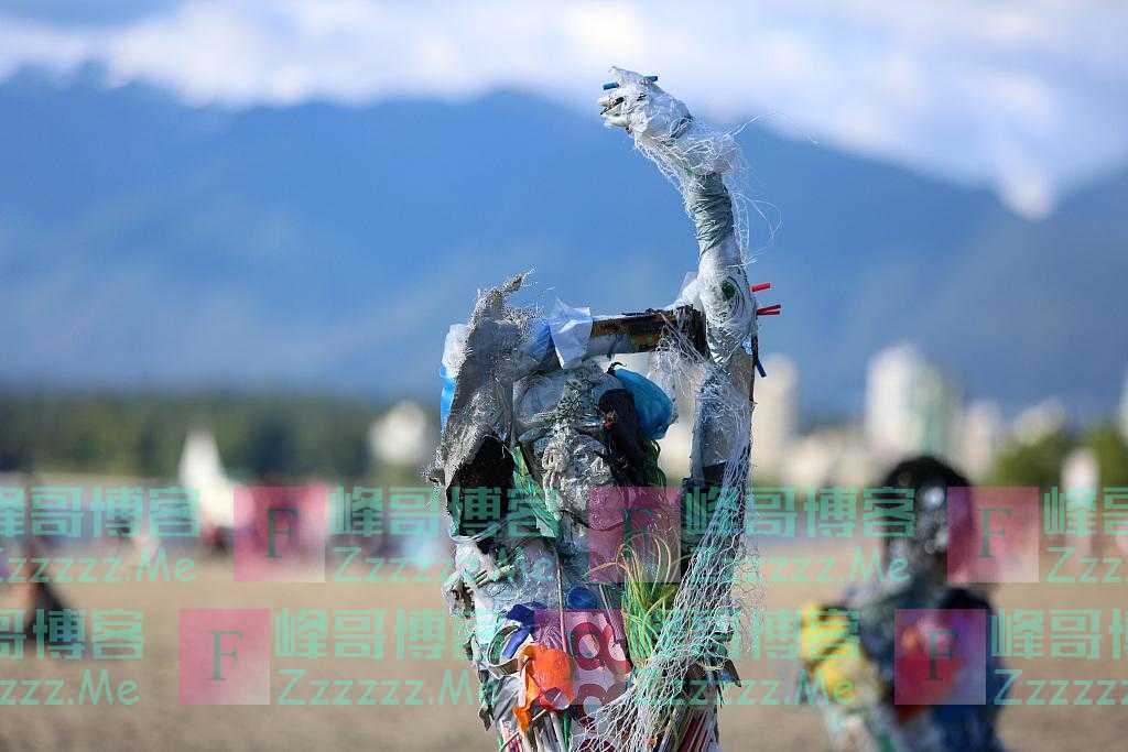 本文转自【视觉中国】;当地时间2021年6月7日,加拿大温哥华,跨学科艺术家Caitlin Doherty收集海洋垃圾制作塑料雕塑,并将雕塑放置于Kitsilano沙滩上进行展览,以呼吁社会加强环保意识。