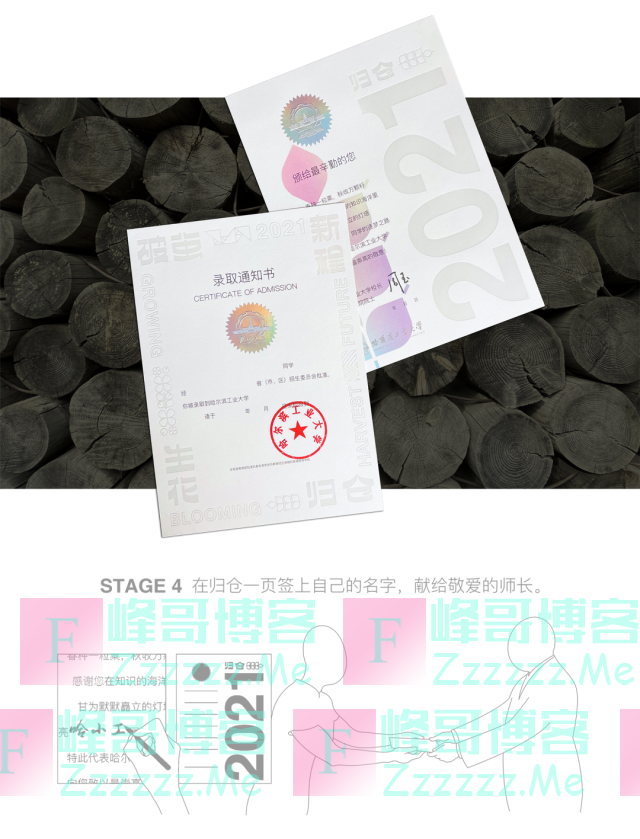 外封套象征一种突破自我、破茧而出的含义;通知书外盒则烫印了冰裂纹的样式,来呼应 “冰冻三尺非一日之寒”的自我勉励与坚持;通知书本身采用 “樱雪”特种纸张,它的烫印工艺具有很强的凹凸触感,象征着学生们一步一个脚印的积累与努力。