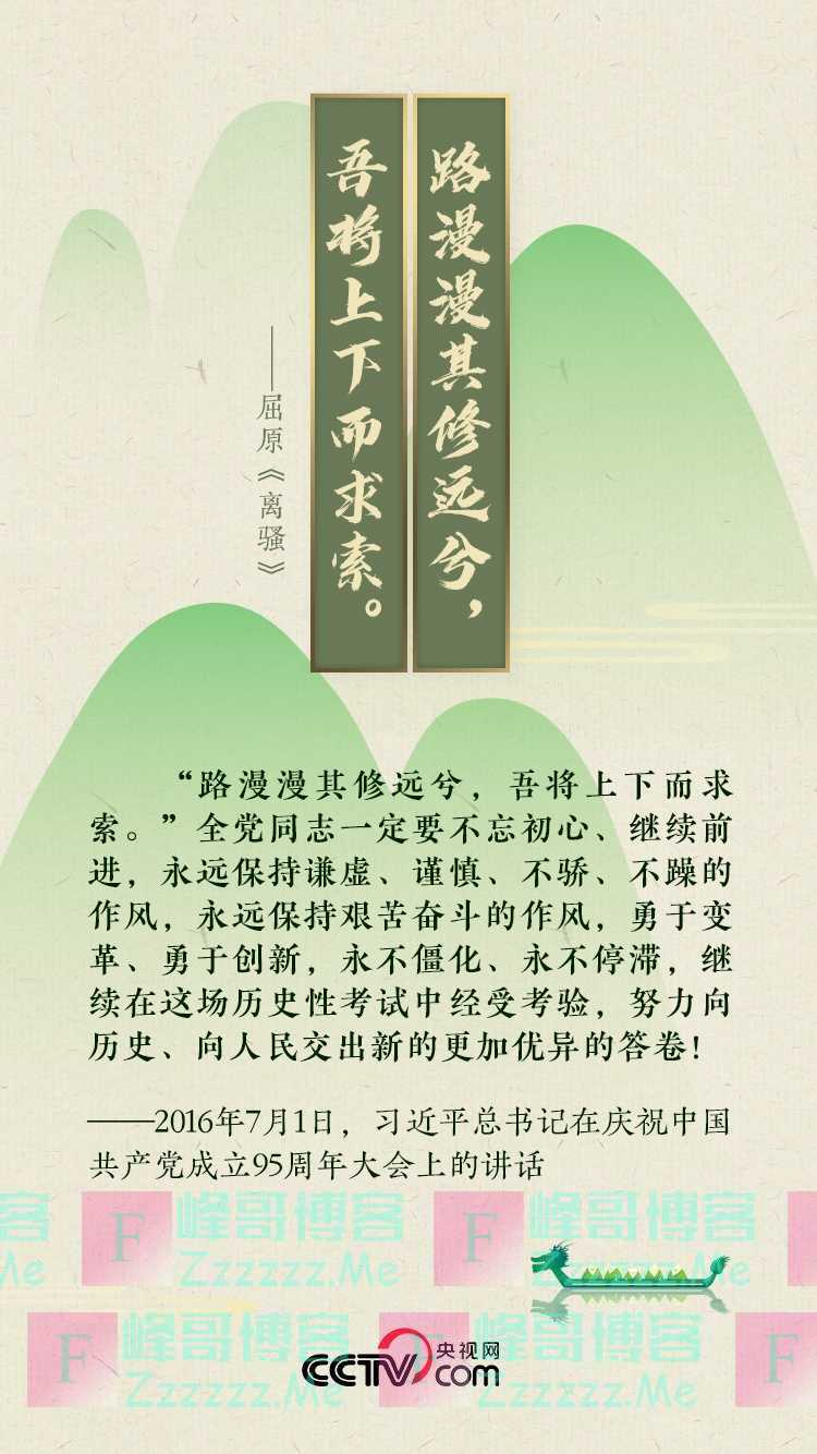 2016年7月,在庆祝中国共产党成立95周年大会上,习近平总书记娓娓道出屈原的名句“路漫漫其修远兮,吾将上下而求索”,号召全党同志不忘初心,勇于变革创新,继续前进。