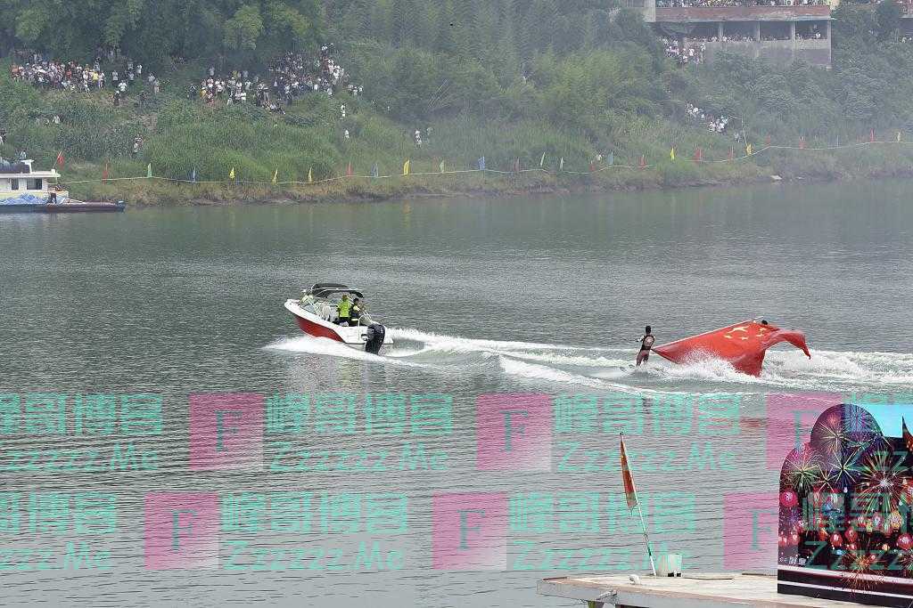 6月12日,重庆市铜梁区安居古城“龙舟会”上的精彩水上特技表演秀,表演队员在宽阔的江面上拉出国旗,在摩托艇的驱动下绕场一周,五星红旗迎风猎猎作响,现场响起热烈的欢呼声。 图片来源:杨康忠/视觉中国