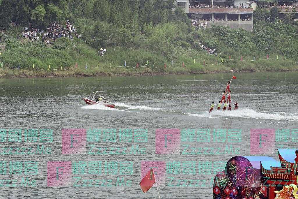 6月12日,重庆市铜梁区安居古城“龙舟会”上的精彩水上特技表演秀,让现场观众大呼过瘾。 图片来源:杨康忠/视觉中国