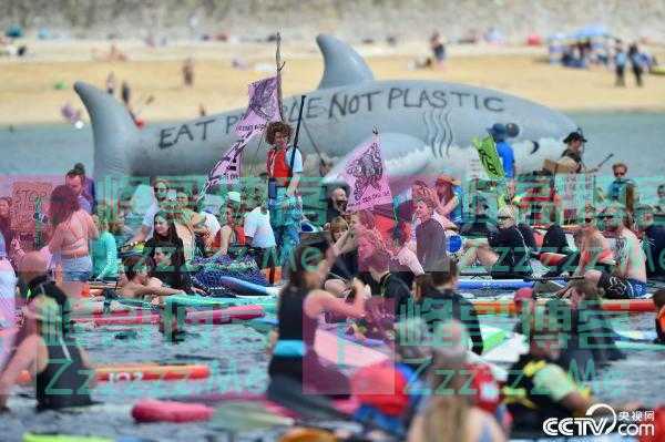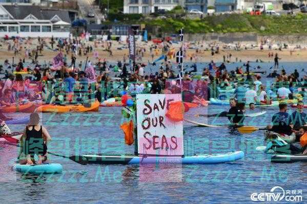 当地时间2021年6月12日,英国康沃尔,七国集团峰会举行期间,在法尔茅斯附近的Gyllyngvase海滩上,抗议者参加由环保组织发起的划水活动。 人民视觉