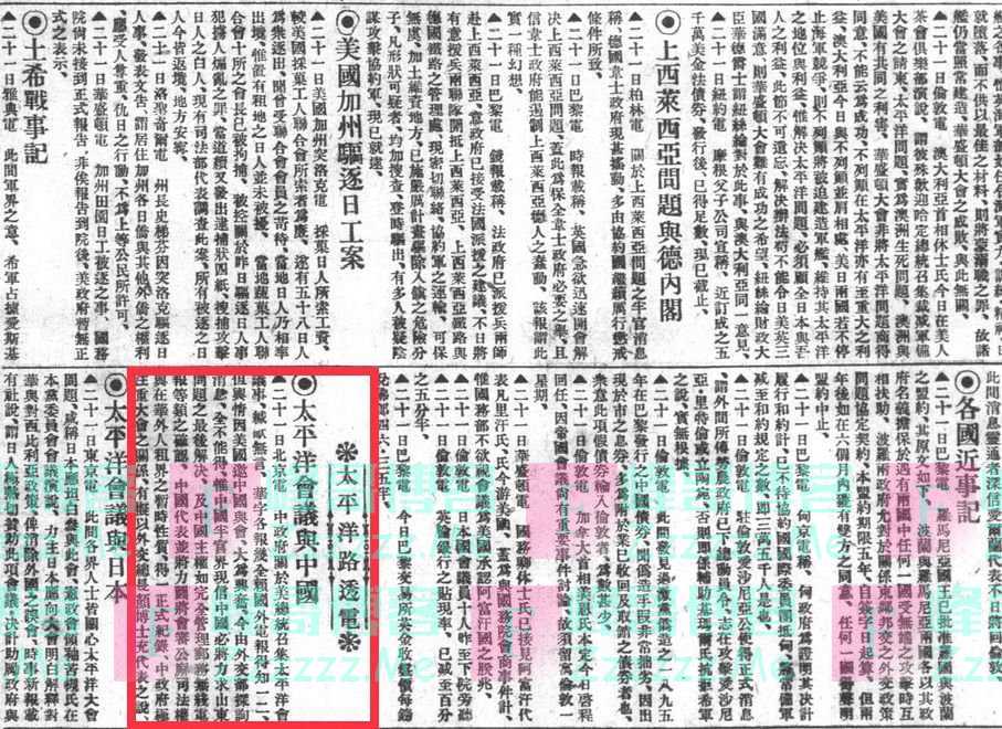 1921年7月23日《申报》上的消息《太平洋会议与中国》。新华社发(上海图书馆提供)