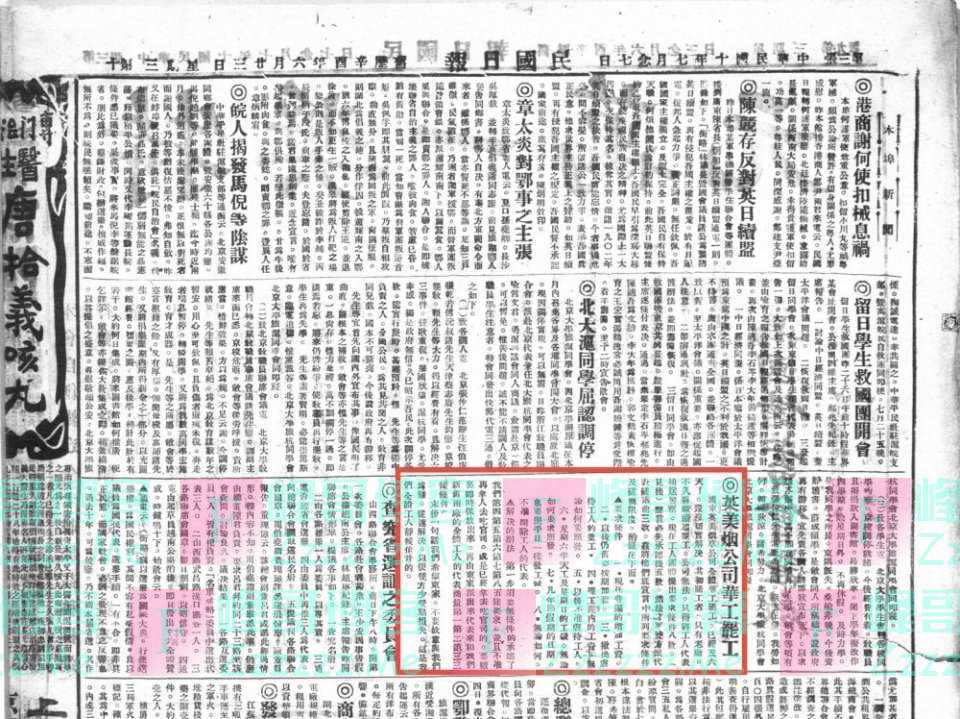 1921年7月27日的《民国日报》上,登载了上海浦东英美烟草公司华工罢工的消息。文中列着工人提出的条件:撤换虐待工人的监工;以后不准虐待工人;无论如何,不准开除工人的代表……