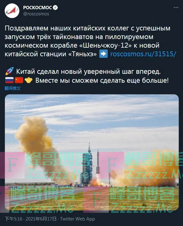 俄联邦航天局也在推特上祝贺了中方:“祝贺我们的中国同行成功将神舟十二号载人飞船,以及3名‘taikonauts’送入天和空间站(核心舱)。中国向前迈出了自信一步!团结一致,我们能做到更多!”