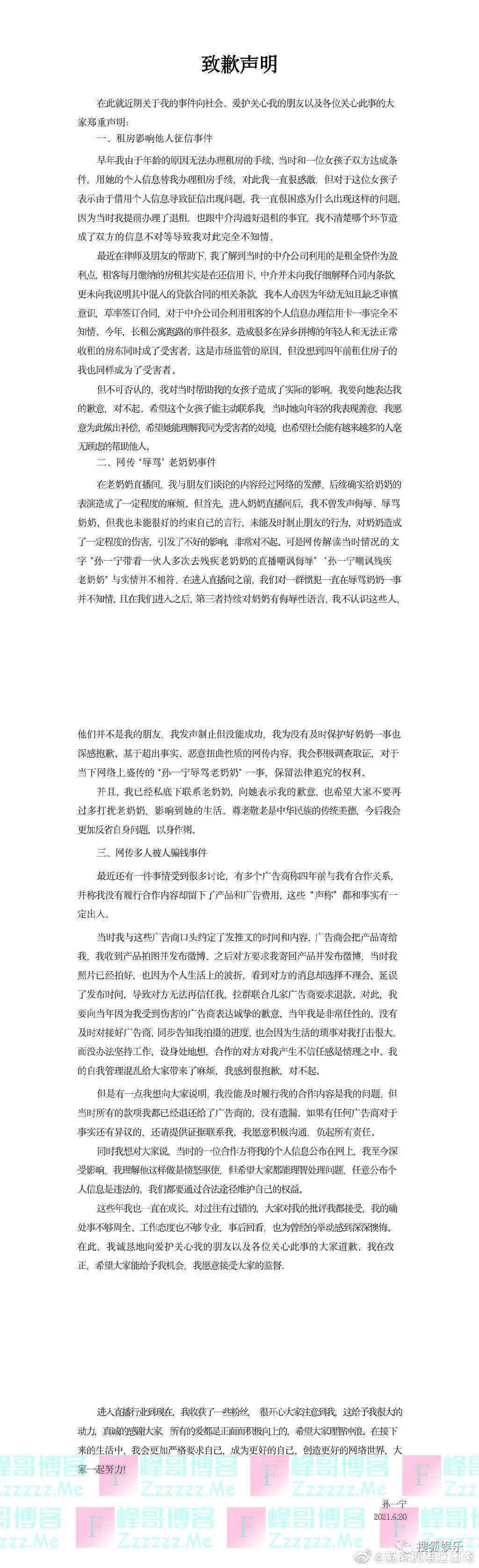 昨天晚上,孙一宁先是就“影响他人征信”、嘲讽老奶奶、多人被骗钱事件发布了致歉声明。(关于嘲讽老奶奶和多人被骗钱事件可戳上面链接回顾)
