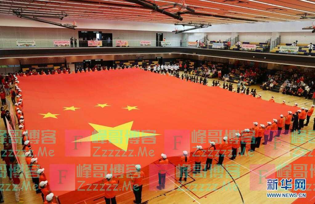 本文转自【新华网】; 7月1日,在香港坑口体育馆,香港市民展示大型国旗。新华社记者 李钢 摄