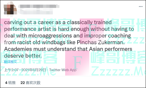 “要想成为一名古典音乐学家,不忍受像祖克曼这样的种族主义老手的冒犯和不当指导,是很困难的。学院必须明白,亚裔演奏者们值得更好的。”
