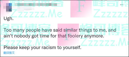 “唉。太多人跟我说过类似的话了,根本没有人有时间理会这种蠢话。请把你的种族歧视留给自己。”