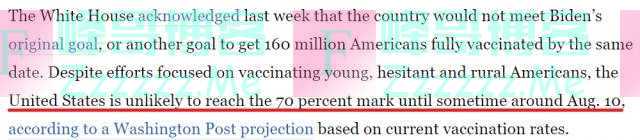 首先就是在7月4日美国独立日到来之前,拜登曾经承诺的为美国70%成年人至少接种一剂疫苗的目标成了泡影。
