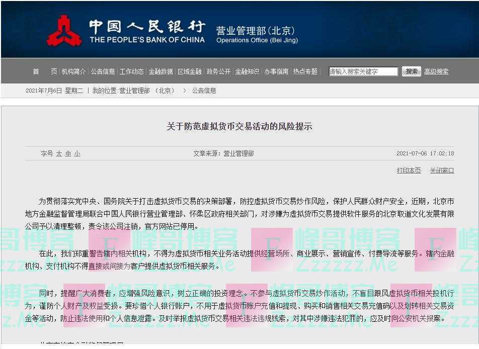 7月6日,人民银行营业管理部发布公告称,我们郑重警告辖内相关机构,不得为虚拟货币相关业务活动提供经营场所、商业展示、营销宣传、付费导流等服务。辖内金融机构、支付机构不得直接或间接为客户提供虚拟货币相关服务。