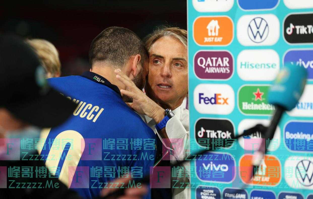 曼奇尼拥抱博努奇。7个本届欧洲杯常规时间,共出现7次点球罚丢的情况,这是欧洲杯至今的历史最高纪录。