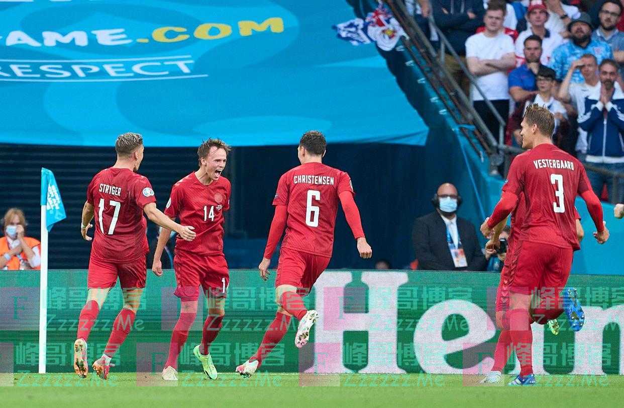 达姆斯高(14号)直接任意球破门。“00后”丹麦球员达姆斯高是欧洲杯历史上第一位进球的“00后”,也是本届欧洲杯迄今最年轻的进球者。