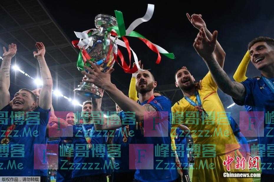 7月12日,在英国伦敦温布利大球场,意大利通过点球大战击败英格兰,问鼎欧洲杯冠军,意大利球员们高举奖杯庆祝。