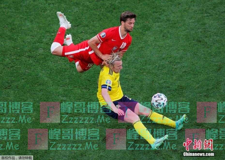 当地时间6月23日,在瑞典对阵波兰的比赛中,瑞典球员福斯贝里与波兰球员巴托斯·贝雷辛内斯基争抢球权。