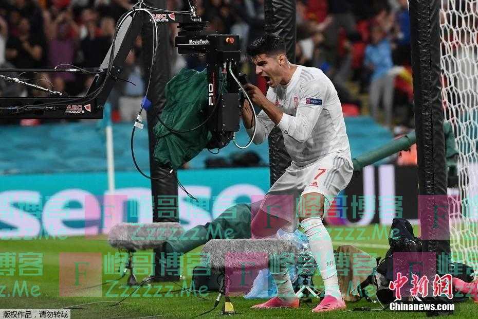 当地时间7月6日,在西班牙对阵意大利的欧洲杯半决赛中,西班牙前锋莫拉塔进球后对着摄像机欢呼。