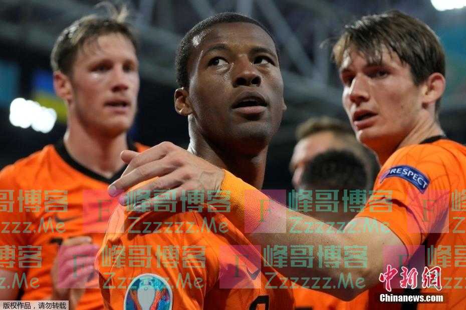当地时间6月13日,在乌克兰对阵荷兰的比赛中,荷兰队维尔纳杜姆与队友一起庆祝进球。