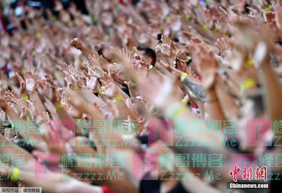 当地时间6月15日,在匈牙利对阵葡萄牙的比赛中,狂热的球迷们举起双手为球队加油助威。