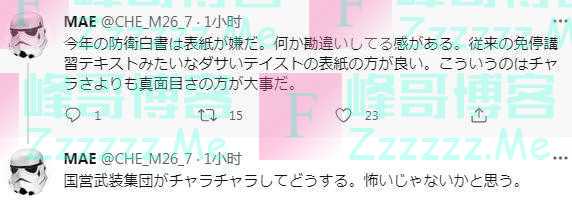 “我讨厌今年《防卫白皮书》的封面。感觉(防卫省)有些误会。往年的那种像教科书一样的‘土设计’更好。在这种事情上,脚踏实地比轻佻吸眼球更重要。国家掌控的武装力量变得轻佻像话么,让人害怕。”