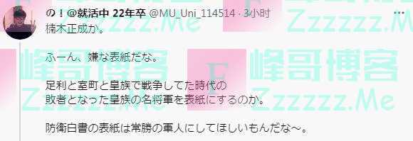 “楠木成正么,令人感到不舒服的封面。在足利、室町与皇室的战争中,他是败军皇室的著名将军,要把败将设为封面么?《防卫白皮书》的封面希望是常胜将军。”