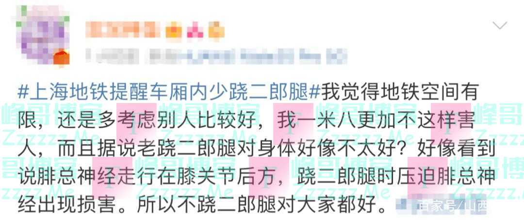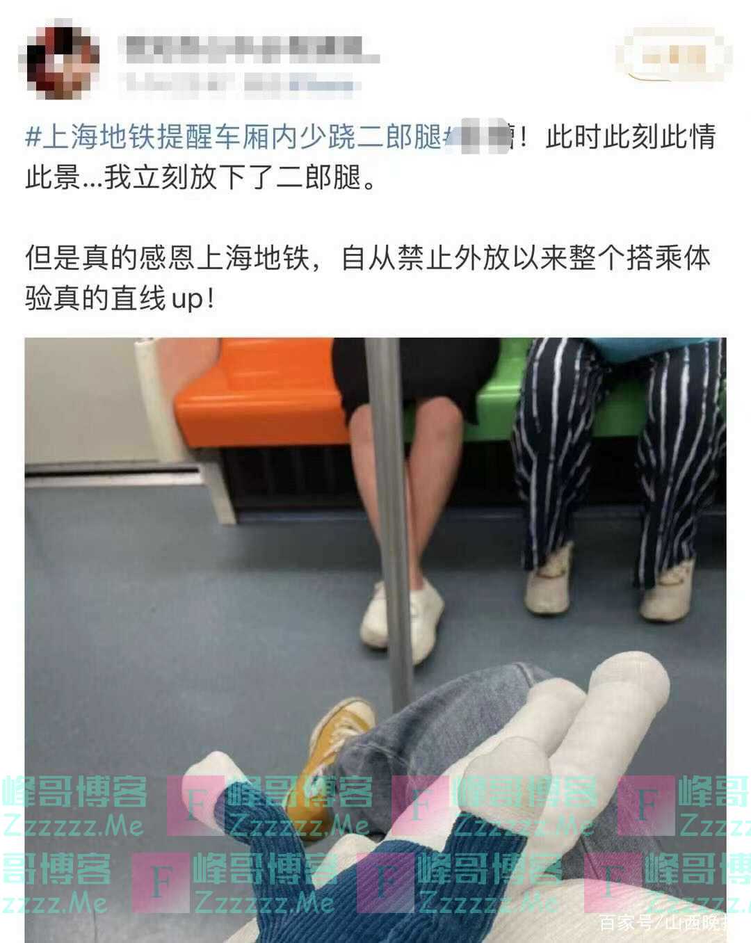 上海地铁运营方回应:在地铁里跷“二郎腿”的行为很常见,但在人多或拥挤的车厢里,此举显然极不合时宜。车厢空间有限,还请多多换位思考,少跷“二郎腿”,以免影响到其他乘客。