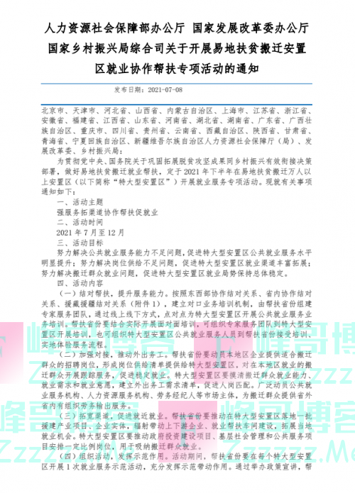 人社部、国家发展改革委等三部门联合开展易地搬迁安置区就业协作帮扶专项活动》发布于2021-7-29