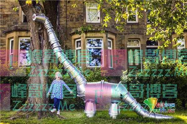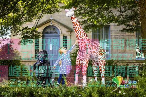 当地时间2021年7月26日,英国约克郡,6岁的Scarlet在Settle花盆节上,玩着完全由花盆做成的长颈鹿和大猩猩。