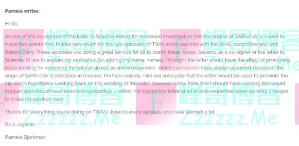 于是,她给自媒体播客节目《本周病毒学》写了一封简短的信,澄清了自己的本意。她说,参与联署《科学》公开信,是因为她原本认为这封信将有助于募集更多资金,用于在动物宿主中寻找病毒。