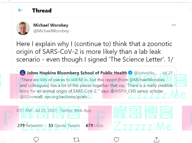 此外,参与公开信联署的亚利桑那大学进化生物学家迈克尔·沃罗比日前也在社交媒体上澄清,他在公开信上签名,让人误以为他认为“实验室泄漏”假说更有可能,但实际上他认为动物起源更有可能。