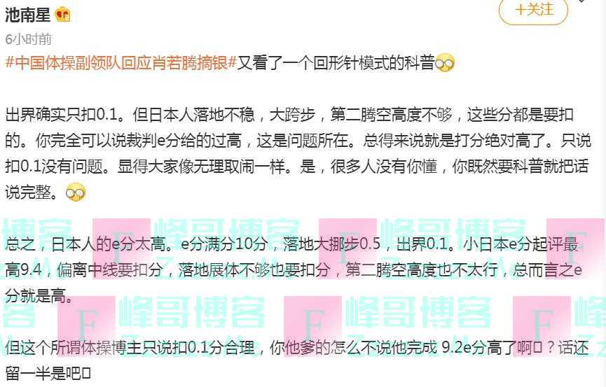 前体操全能冠军杨威就从专业角度为肖若腾鸣不平:“桥本的跳马起跳、第二腾空和落地加起来只扣了0.9确实是稍显不公。”