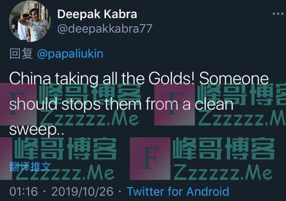 2019年10月16日,卡布拉曾在个人推特上写道:“中国包揽了所有金牌!应该有人阻止他们大获全胜。”有人还查证,这位印度裁判正好执法了昨晚那场比赛中争议巨大的跳马项目。