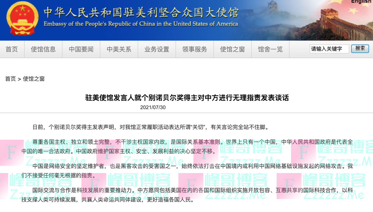 中国驻美使馆发言人就个别诺贝尔奖得主对中方进行无理指责发表谈话》发布于2021-7-30
