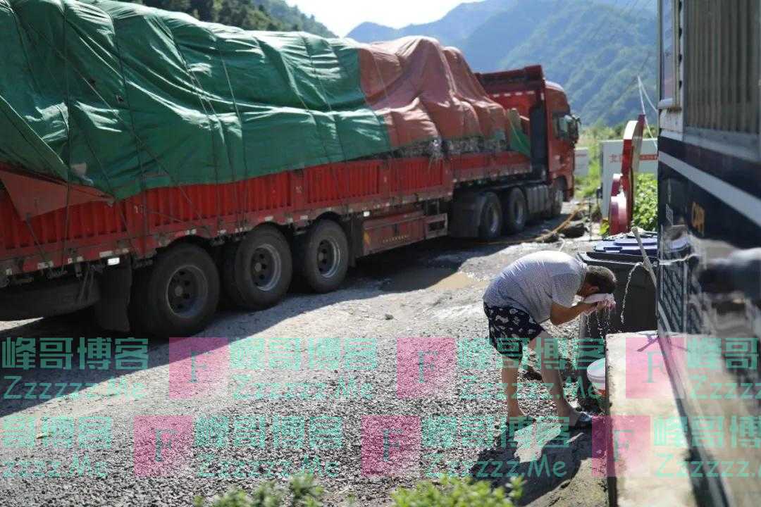7月19日下午3点刚过,货车流量高峰就来了,到劝导站前排队加水的重型货车明显多了。陕西籍司机老张跳下车,趁着给车子加水,拿了块毛巾,给自己也冲了个澡。驾驶室里,一个电饭煲、两副碗筷、一床被子,老张的妻子正坐在副驾驶座上打着瞌睡。