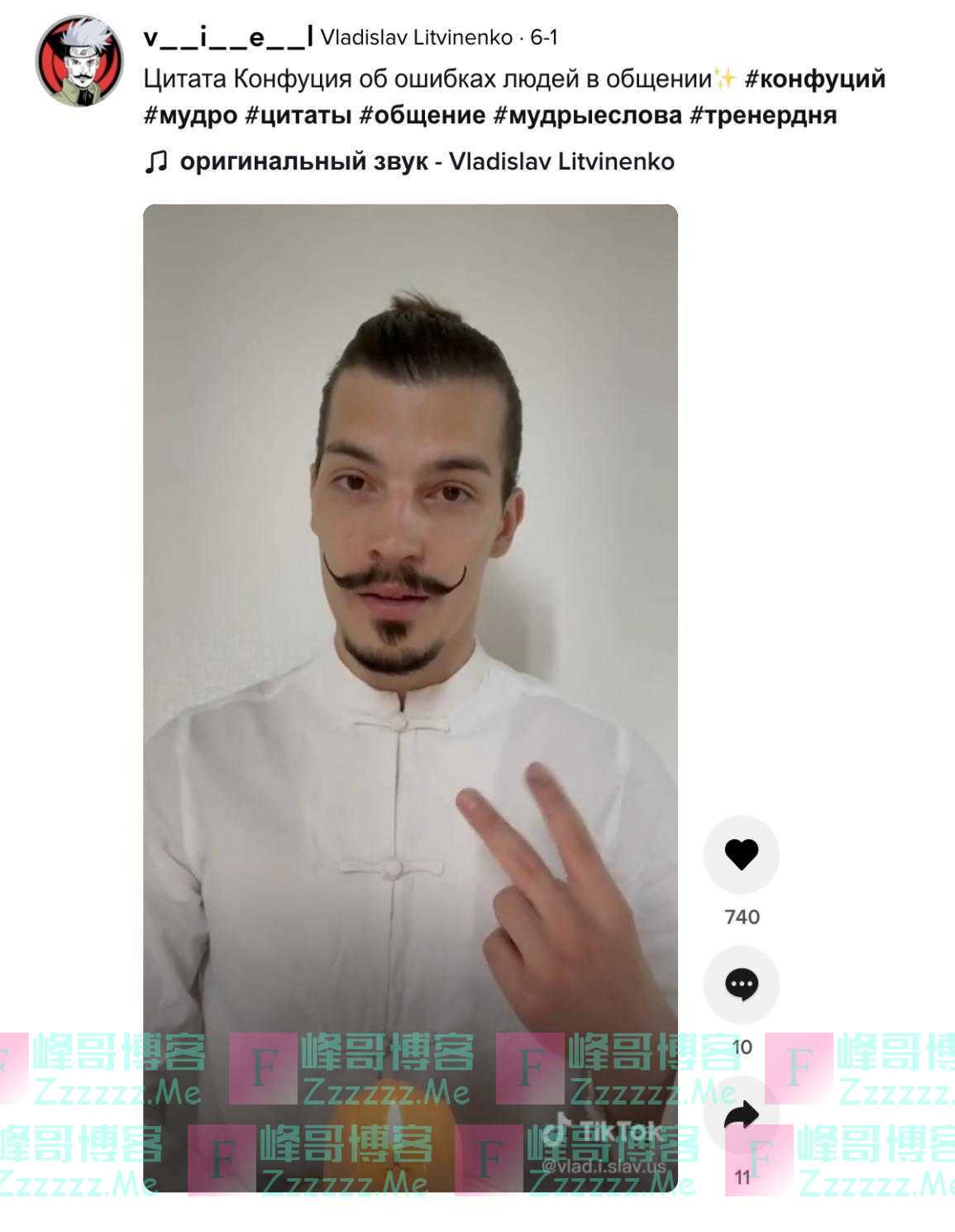 TikTok用户@v__i__e__l是一位讲俄语、酷爱中国功夫的硬汉,他喜欢在视频中把自己的武打姿势与动漫人物的武术动作拼接在一起,画面毫无违和感。令人想不到的是,这样一位习武硬汉,竟然十分尊崇孔子。