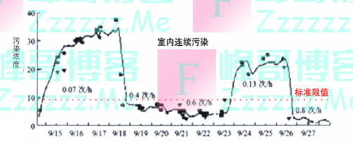 很多人可能会问,选择新风究竟是选择大风量,还是选择低风量的,主要还是根据室内污染有关。下图为实验室做出的室内连续污染物的通风效果试验。其中X轴表示时间,Y轴表示污染浓度。我们发现随着单位通风次数/每小时数量的增加,能够大幅度的降低室内污染的空度,至少保证0.4次/h,才能保证基本的空气质量。