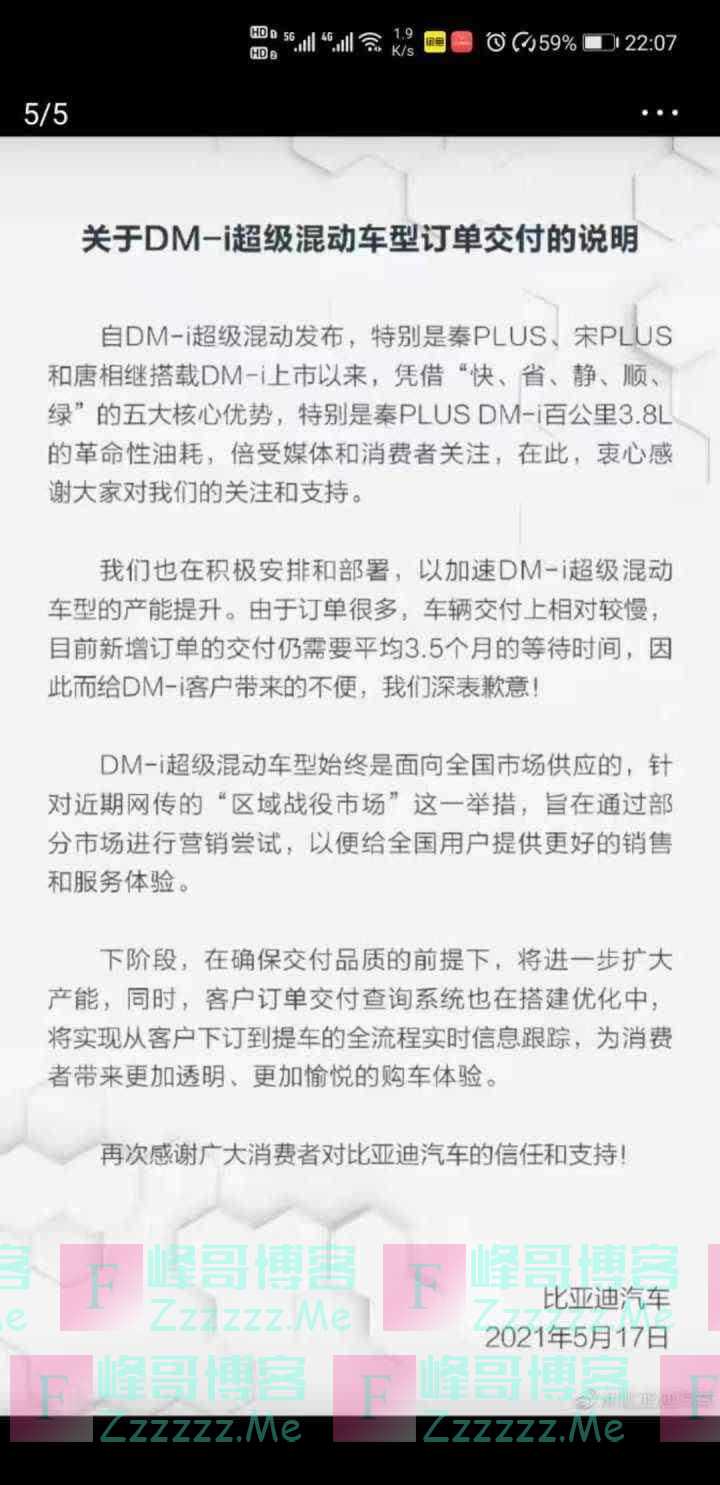 5月17日,比亚迪官方致歉表示,由于订单较多,产能不足,DM-i车型的新增订单平均等待周期为3.5个月。