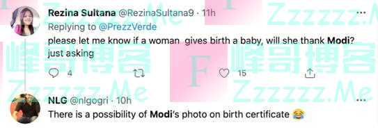 有网友说,“请告诉我如果一个女人生了小孩,她也会感谢莫迪吗?就是问问。”下面很快有人回复这名网友说:“莫迪的照片有可能会出现在出生证明上面。”↓
