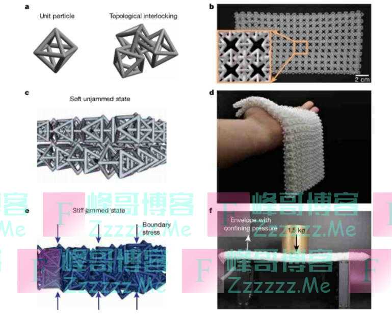 美国加州理工学院的Chiara Daraio和同事设计了一种由3D打印的聚合物元素(而非织物)联锁而成的面料,这种面料能在柔软和坚硬的形状间逐渐切换。处于天然状态时,这种面料易弯折,能披挂在复杂物体表面。处于压缩状态时,面料的联锁颗粒会挤在一起,坚硬度是松散状态下的25倍左右。最后得到的结构,其最大载重量为自身重量的30倍以上。作者认为,这种特性预示了穿戴式可重构结构的光明前景,可重构面料可能需要贴合人体,或是能在形成复杂结构后固定住。