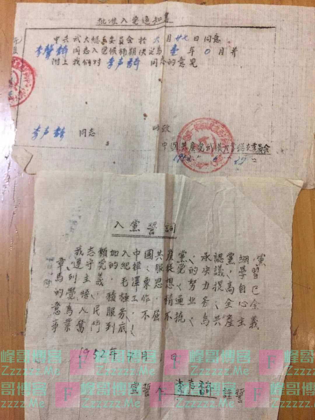 李声珍藏的入党誓词及批准入党通知书。图片由甘子久提供
