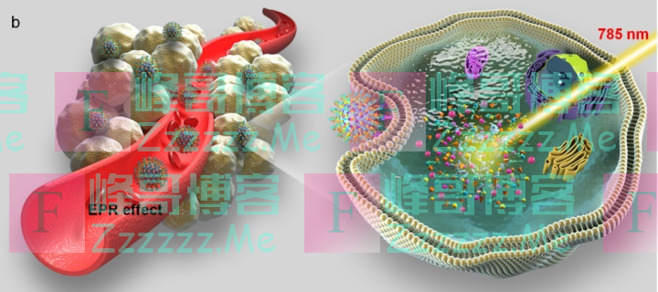 团队使用聚乙二醇和cRGDfK多肽对载体进行结构修饰(如上图的绿毛毛卷,它就像一层伪装外套,使得药物可以顺利地在血管中航行),使其具备高度的血循环稳定性和肿瘤靶向特异性,使纳米药物可以持续、稳定、精准地投递到肿瘤部位,并进行富集,再利用近红外光对肿瘤部位的药物进行光控激活,实现精准肿瘤治疗。