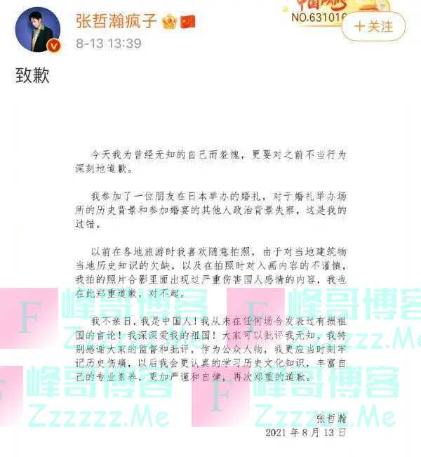 张哲瀚还说,“我从未在任何场合发表过有损祖国的言论!我深深爱我的祖国!大家可以批评我无知。我特别感谢大家的监督和批评,作为公众人物,我更应当时刻牢记历史伤痛,以后我会更认真的学习历史文化知识,丰富自己的专业素养,更加严谨和自律,再次郑重的道歉。