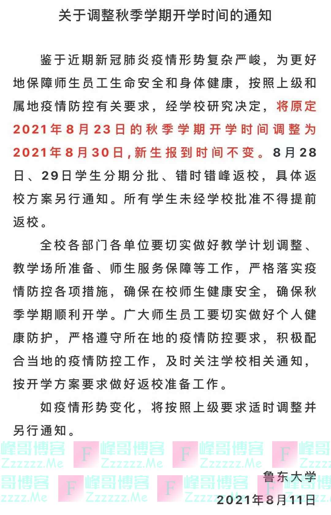 山东部分高校发布通知 秋季学期将延迟开学》发布于2021-8-15