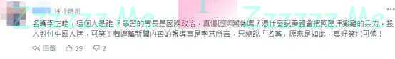 对于李正皓的这番论调,不少岛内网友并不买账。有网友表示,“‘名嘴’李正皓,这个人是谁?学习的专长是国际政治,真懂国际关系吗?凭什么说美国会把阿富汗撤离的兵力投入对付中国大陆,可笑!若这篇新闻内容的报道真如李某所言,只能说‘名嘴’原来是如此,真好笑也可怜!”↓