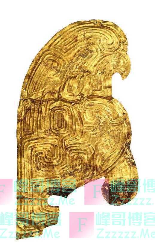 不仅如此,有学者推测,鸷鸟形金饰片与鳞形金饰片、窃曲形金饰片等等共同组合成鸷鸟形装饰,那些零散的其他形状的金饰片不过是鸷鸟造型的一部分。既为饰片,这些金饰片本是做装饰之用,金饰片边缘成对的小孔洞证明了这一点。鸷鸟形金饰片当是钉在秦国国君殓葬的棺椁之上,其他金饰片或装饰车舆,或装饰甲胄……遥想两千多年前秦公大葬,铜器峥嵘、金饰灿烂,当是多么盛大奢华的葬礼!