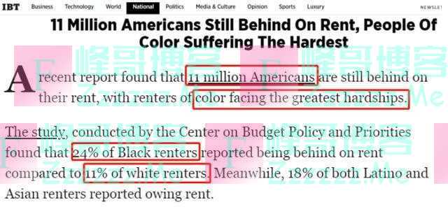 △《国际财经时报》(IBT)网站:近期报告显示,美国仍有1100多万成年人无力按时缴纳房租,少数族裔面临的困难尤甚,有24%的黑人租户拖欠租金,而白人租户拖欠租金的比例仅为11%。