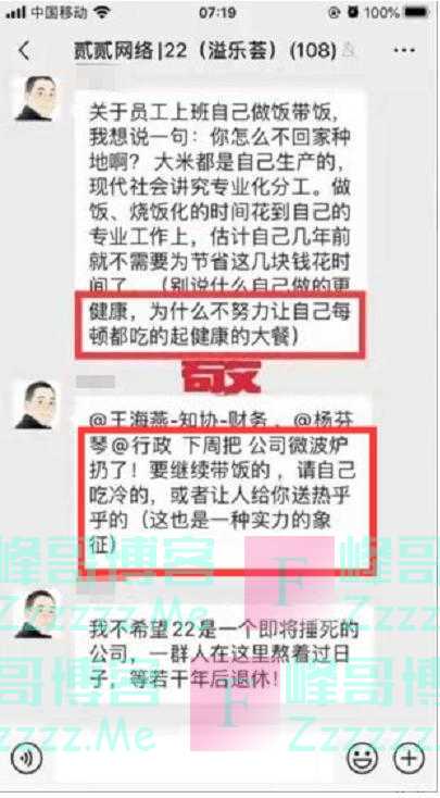 网传截图 来源:微博群聊截图显示,微信群聊名“贰贰网络|22(溢乐荟)”里,一微信用户许某某在发言称,“关于员工上班自己做饭带饭,我想说一句:你怎么不回家种地啊?大米都是自己生产的,现代社会讲究专业化分工……别说自己做的更健康,为什么不努力让自己每顿都吃的起健康的大餐。”许某某发表完上述言论后,在群聊中通知公司财务和行政,称“下周把公司微波炉扔了!要继续带饭的,请自己吃冷的,或者让人给你送热乎乎的(这也是一种实力的象征)”。