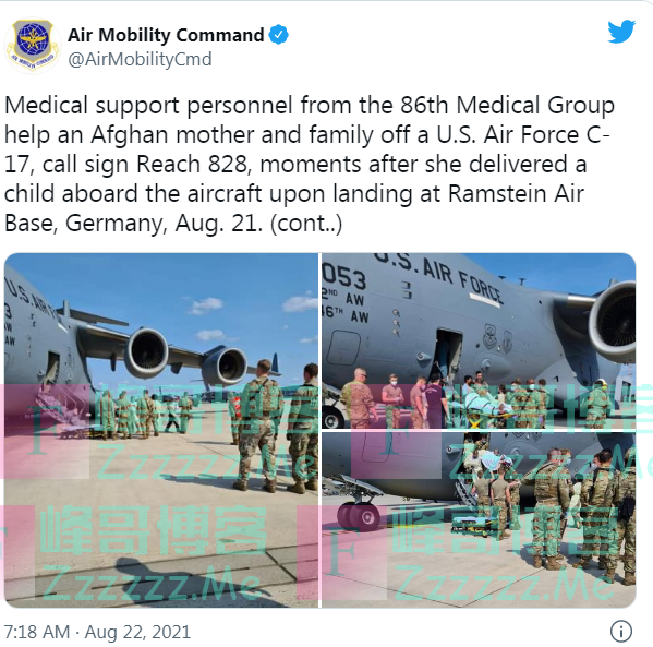 宣传?美空军发推:阿富汗妇女在撤离的C-17运输机上诞下女婴》发布于2021-8-26