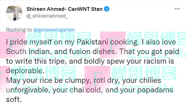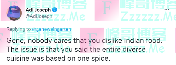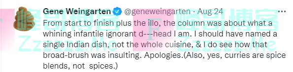 在推文中,他不仅承认了自己的“幼稚及无知”,还提到了自己在文章中的不当之处。“我应该说出一道印度菜的名字,而不是指向所有印度菜,我的确明白那种笼统的说法是多么的无礼。抱歉。”温加滕还补充说,咖喱是混合香料,而不是单一香料。↓